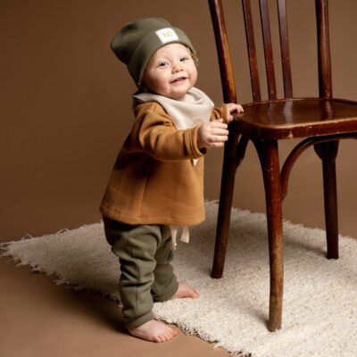 Für viel Bewegungsfreiheit sorgen bei unseren Jersey- und Sweathosen der tiefgezogene Schritt und die elastischen Stoffe. Hingucker sind die aufgesetzten Knopfleisten und die kleinen Taschen. Diese bequemen Hosen fertigen wir in den Größen 50/56, 62/68, 74/80 und 86/92 an.